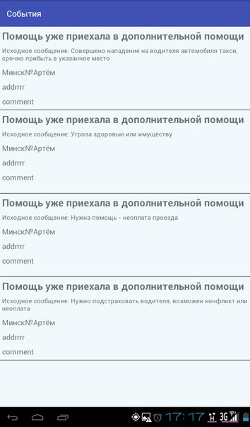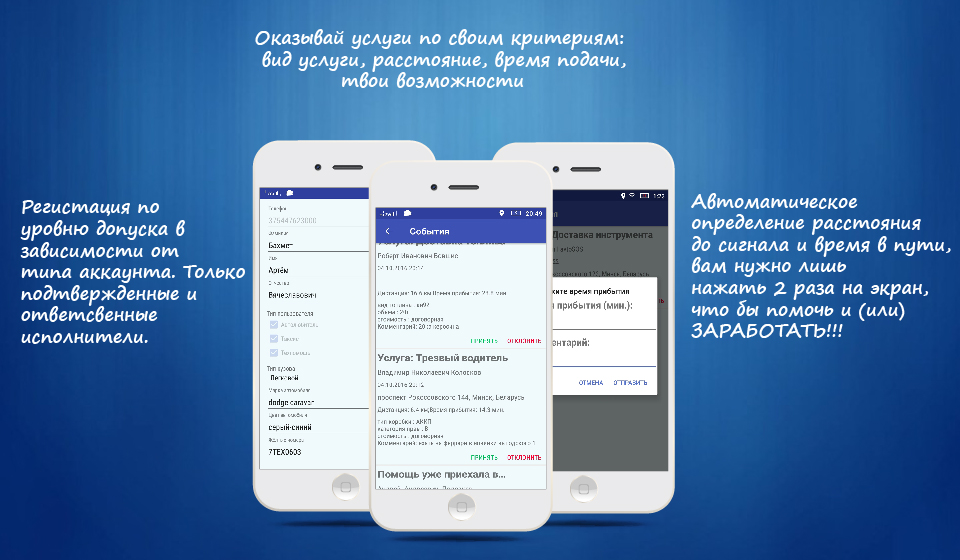 Вам приходит звуковое и визуальное оповещение о помощи SOS, БУЙНЫЕ ПАССАЖИРЫ, НЕОПЛАТА, ПОСТРАХОВКА. Приложение открывается поверх всех окон совместно со звуком воздушной тревоги. В открывшимся окне событий будет окно с информацией о требуемой помощи (Угроза жизни, угроза здоровью или имуществу, неоплата проезда, подстраховать на адресе). Так же данные о вызывающем помощь (имя, служба, позывной, приблизительный адрес, расстояние к адресу и время прибытия к адресу) (дорабатывается). В этом же окне вы можете принять помощь, либо отказать в ней. После нажатия на кнопку принять, вы переходите в другой интерфейс где вам предоставляется полная информация о вызывающем (ФИО, марка авто, цвет авто, гос. номер, служба, №позывного, №телефона) и карта с маршрутом до места тревоги. В этом окне Вам необходимо нажать на кнопку ВЫЕЗЖАЮ, что бы оповестить вызывающего о том, что к нему кто то едет, (дорабатывается).
