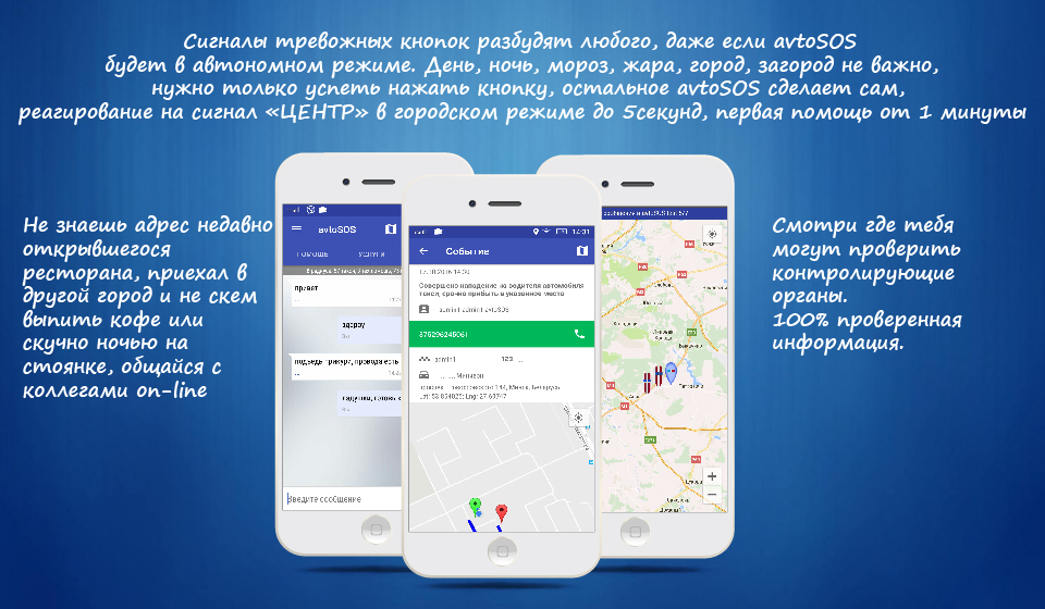Для вызова помощи нужно удерживать кнопку от 1 сек, пока она не поменяет цвет с красного на желтый, вы почувствуете вибрацию гаджета, появиться сообщение «сообщение отправлено» Это означает что сигнал СОС отправлен успешно. В радиусе 5км (город) и 30 км( загород) происходит оповещение пользователей, о том что, на Вас совершено нападение. Ваше местоположение отмечается на карте координатами с графическим путем движения к Вам (точке сигнала). Так же пользователям принявшим Ваш сигнал передается информация о Вас (ФИО, марка авто, цвет, гос.номер и моб. Телефон). На ваш девайс будут приходить оповещения о том что, к вам едут откликнувшиеся водители. Нажатием и удержанием кнопки повторно вы можете отменить сигнал СОС ( например если видите, что помощь уже приехала и в дальнейшей помощи вы не нуждаетесь или сообщений о том что к вам едут, будет предостаточно). Кнопка меняет цвет с желтого на красный, появляется сообщение «сообщение удалено». Всем абонентам